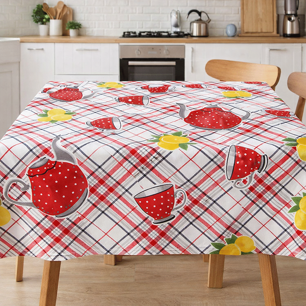 Toalha de mesa alegre e moderna, perfeita para dar mais cor e personalidade à sua cozinha. Com um estampado encantador de bules vermelhos, chávenas e limões sobre fundo xadrez, combina estilo e funcionalidade no dia a dia.