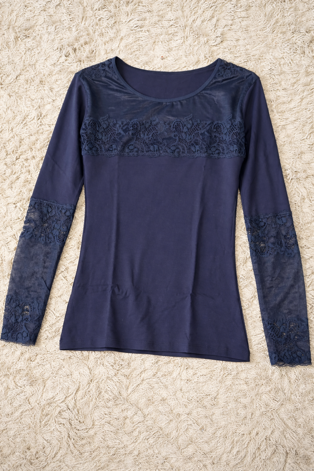 O design destaca-se pelos detalhes em renda delicada no peito e nas mangas, dando um toque sofisticado e feminino, ideal tanto para uso diário como para ocasiões mais especiais.