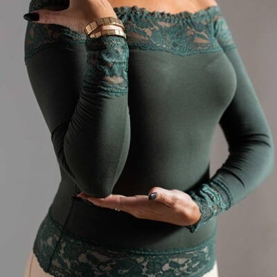 O destaque vai para os detalhes em renda no decote, mangas e barra, que conferem um toque romântico e elegante, ideal para looks modernos e femininos.