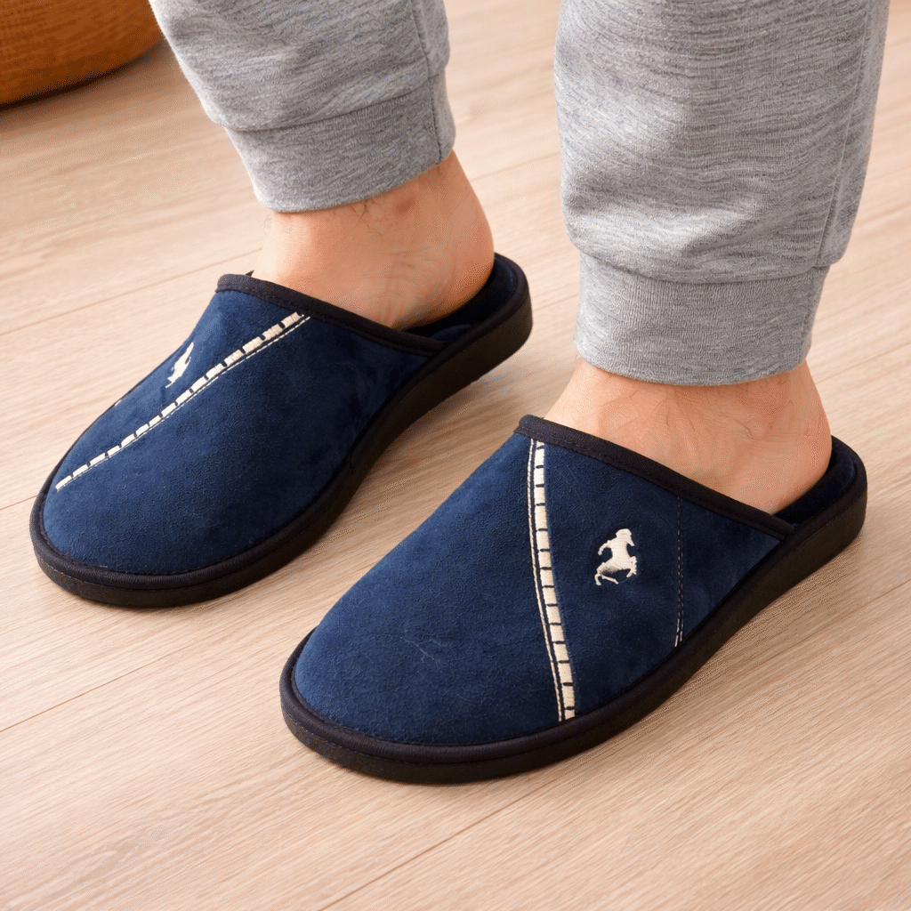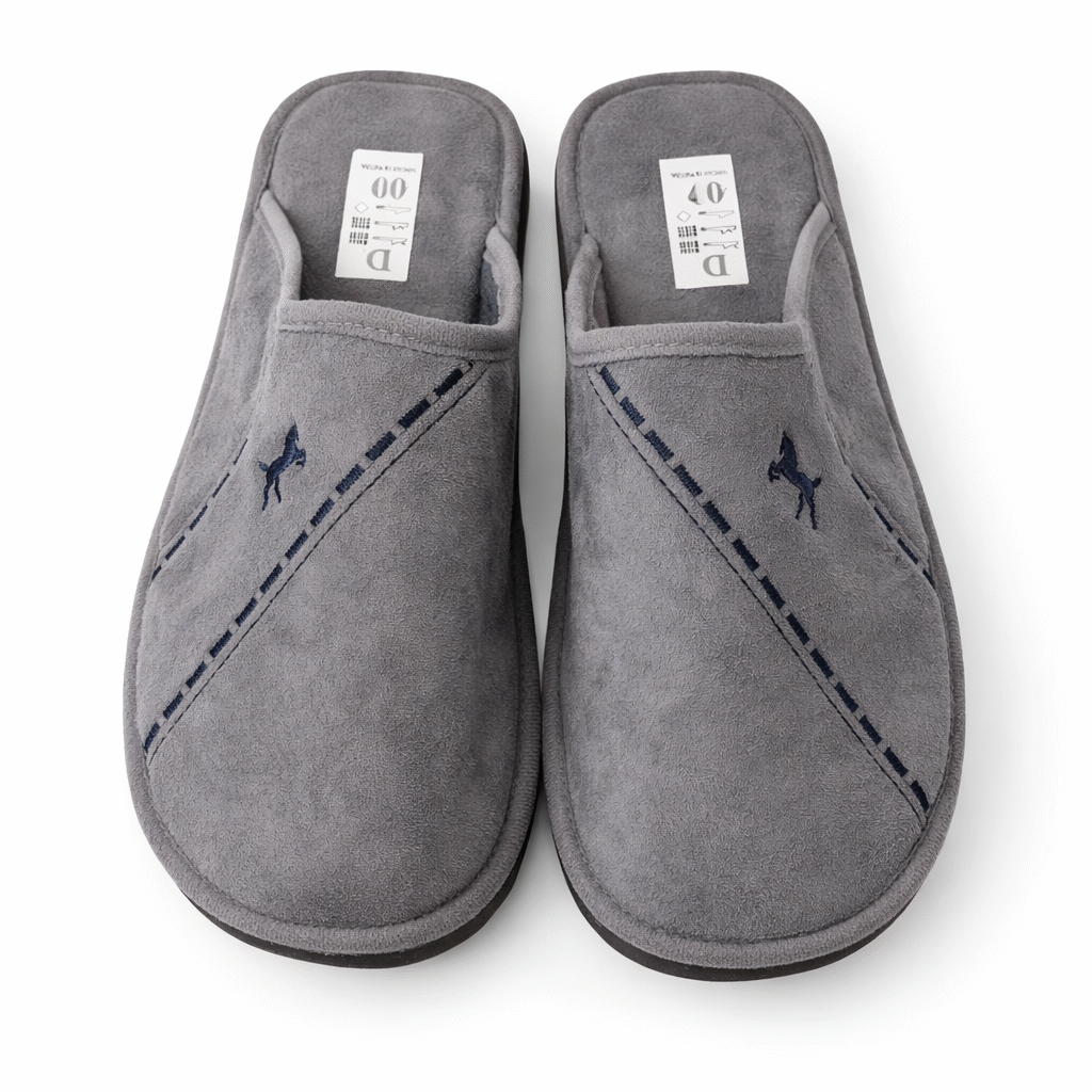 Chinelos de homem fabricados em Portugal, ideais para usar em casa com todo o conforto. Produzidos com material macio e agradável ao toque, proporcionam uma sensação de bem-estar e aquecimento aos pés.