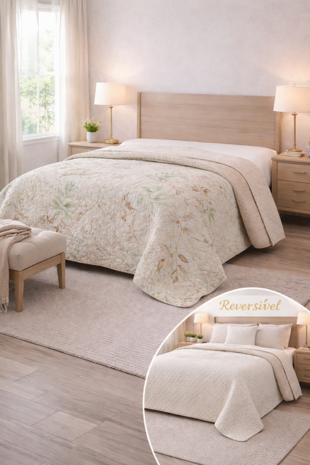 Colcha elegante e versátil, perfeita para dar um toque moderno e acolhedor ao seu quarto. Com design reversível, permite duas utilizações: um lado em tom bege liso, discreto e sofisticado, e o outro com padrão floral suave, ideal para renovar o ambiente sempre que desejar.