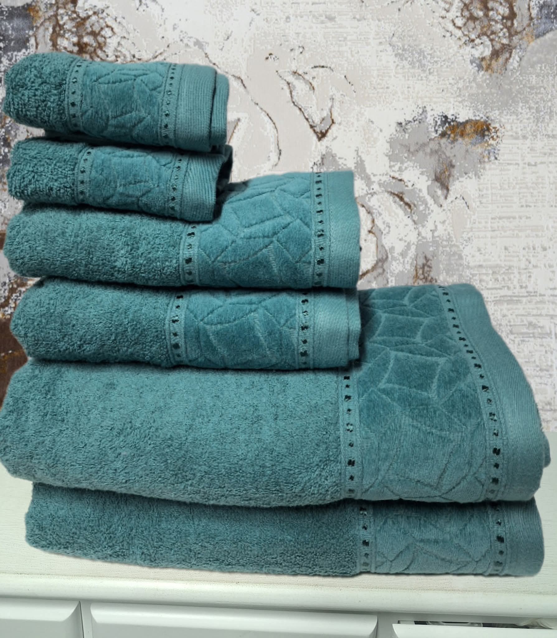 Dê um toque de sofisticação à sua casa de banho com este elegante jogo de toalhas composto por 6 peças. Com um design moderno e faixa decorativa em relevo, combina perfeitamente conforto, qualidade e estilo.