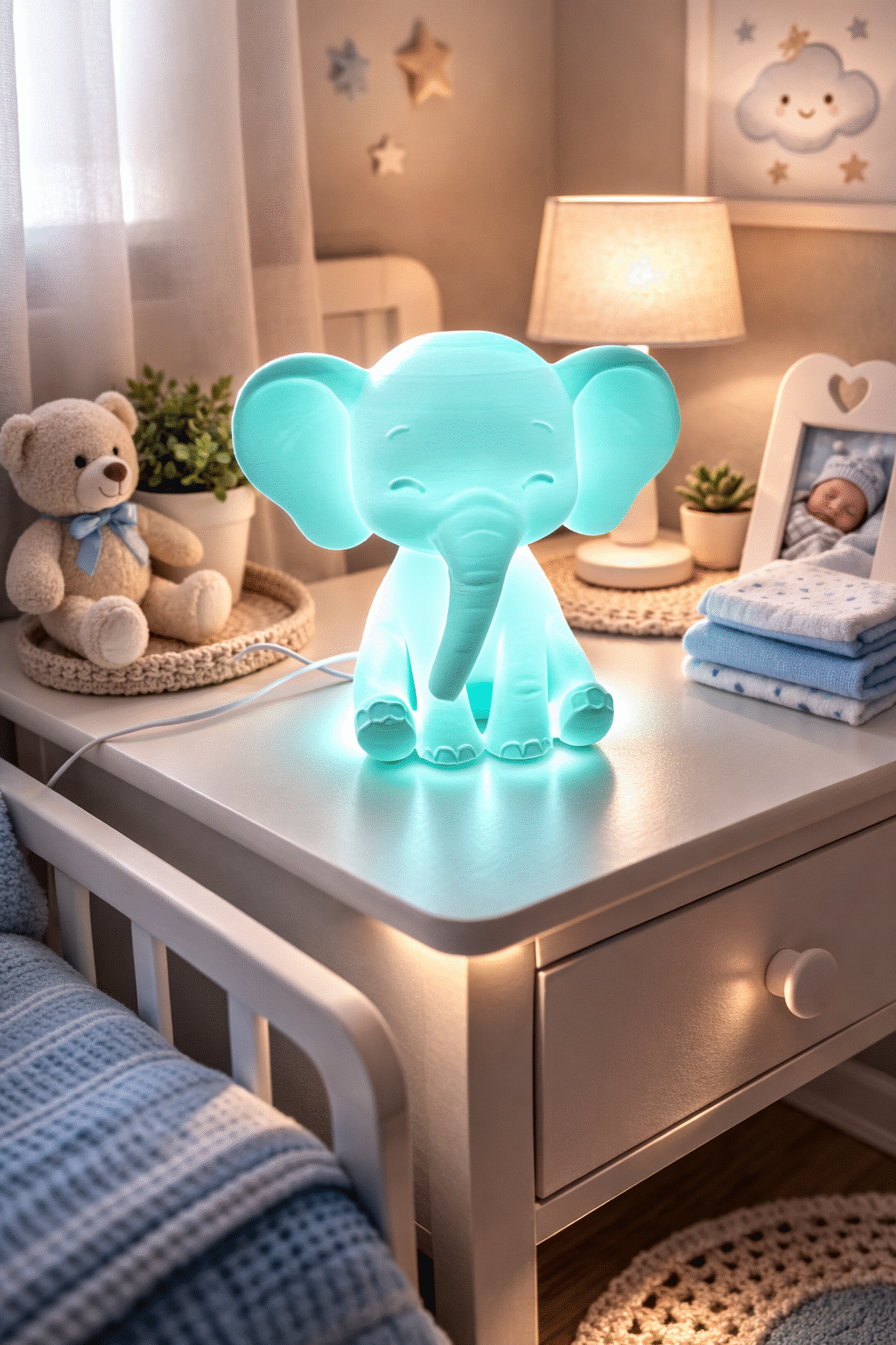 Encantadora luz de presença em formato de elefante, ideal para criar um ambiente tranquilo e acolhedor no quarto do bebé. Com uma iluminação suave e relaxante, ajuda a acalmar o bebé durante a noite, proporcionando conforto e segurança.