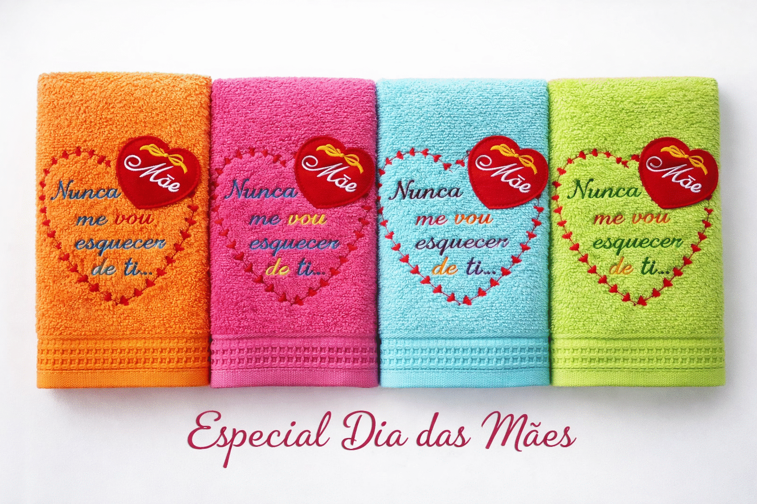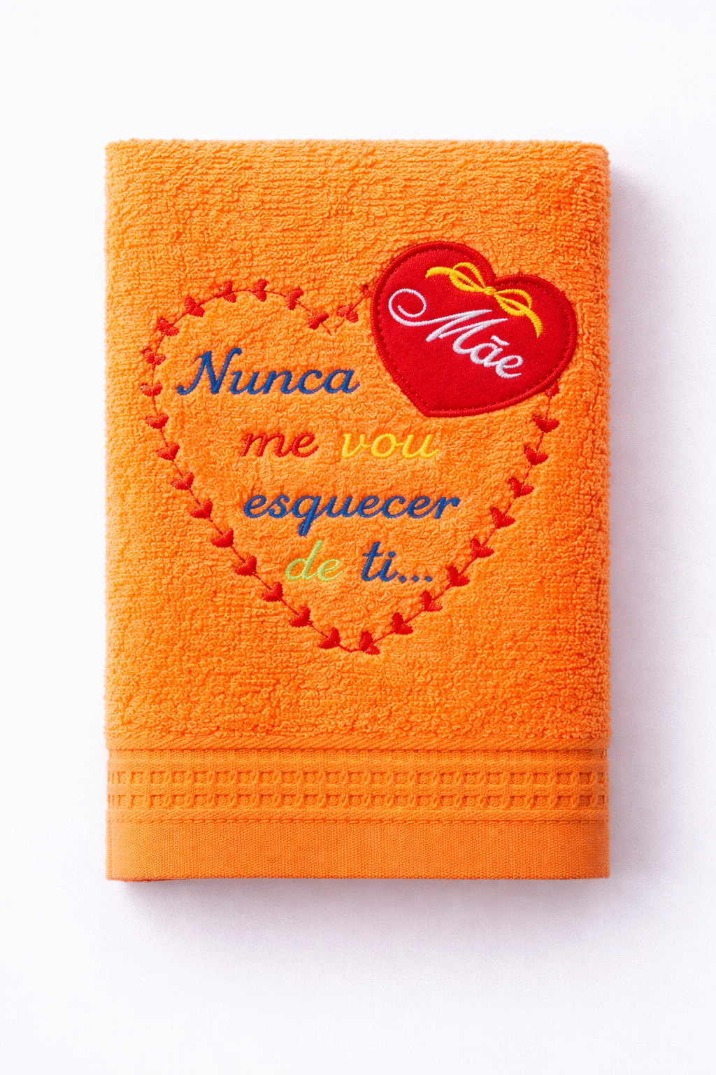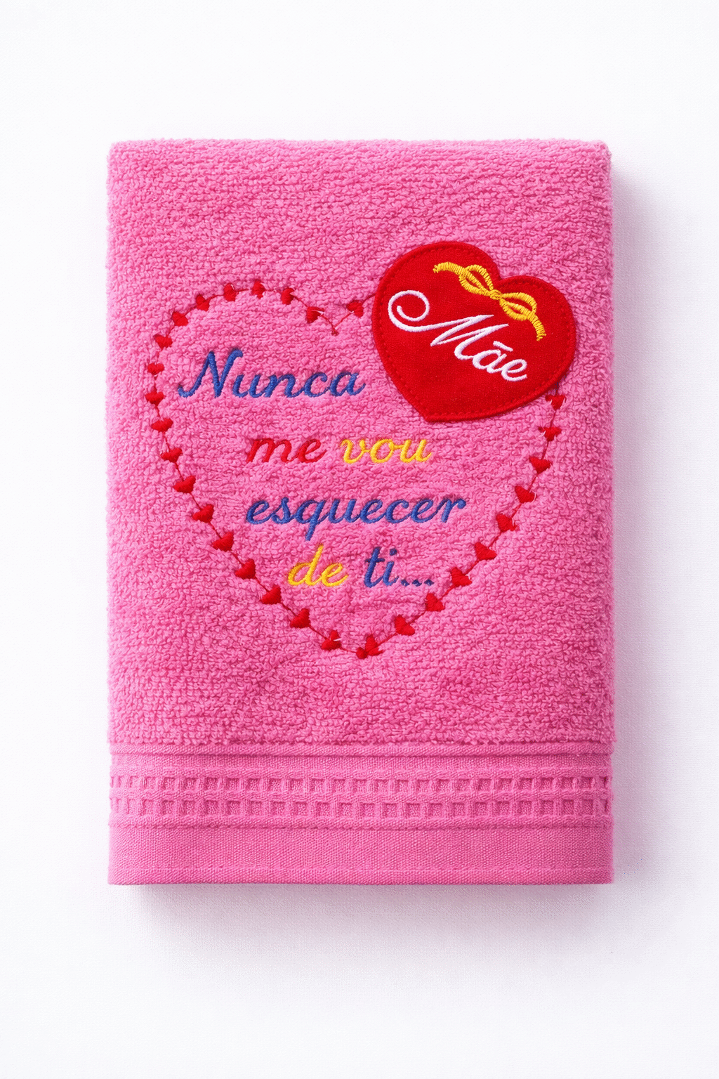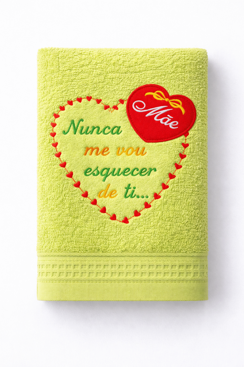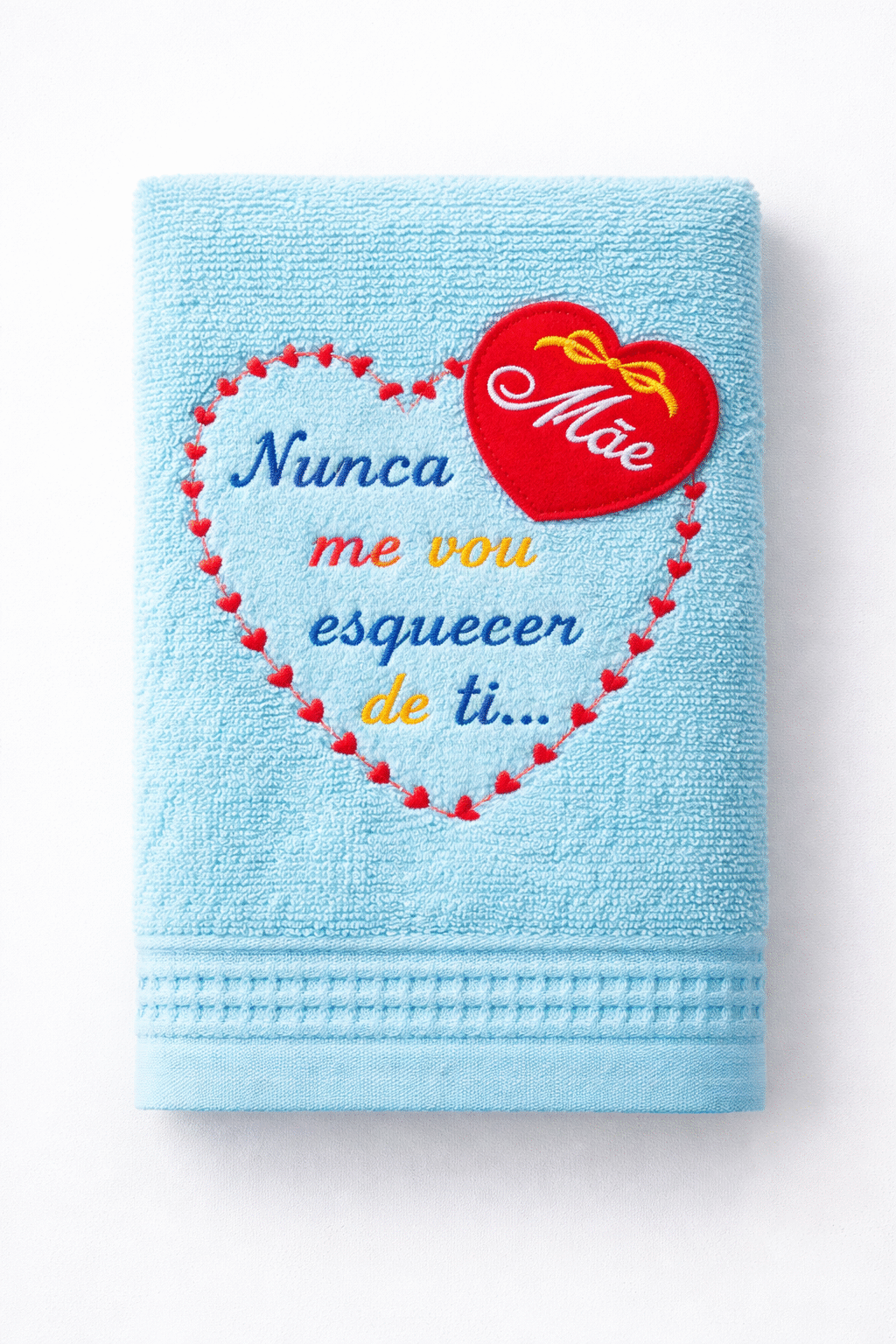 Pano de cozinha em tecido turco macio e absorvente, ideal para uso diário na cozinha. Apresenta um bonito bordado com coração e a frase “Nunca me vou esquecer de ti”, tornando-o uma peça especial e perfeita para oferecer no Dia da Mãe.