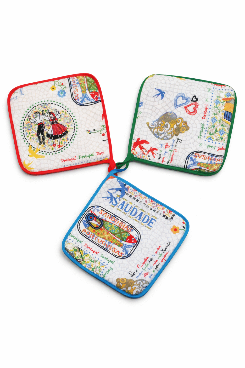 Pegas de cozinha acolchoadas com padrões inspirados na cultura portuguesa, ideais para proteger as mãos ao manusear tachos, frigideiras, tabuleiros ou assadeiras quentes.