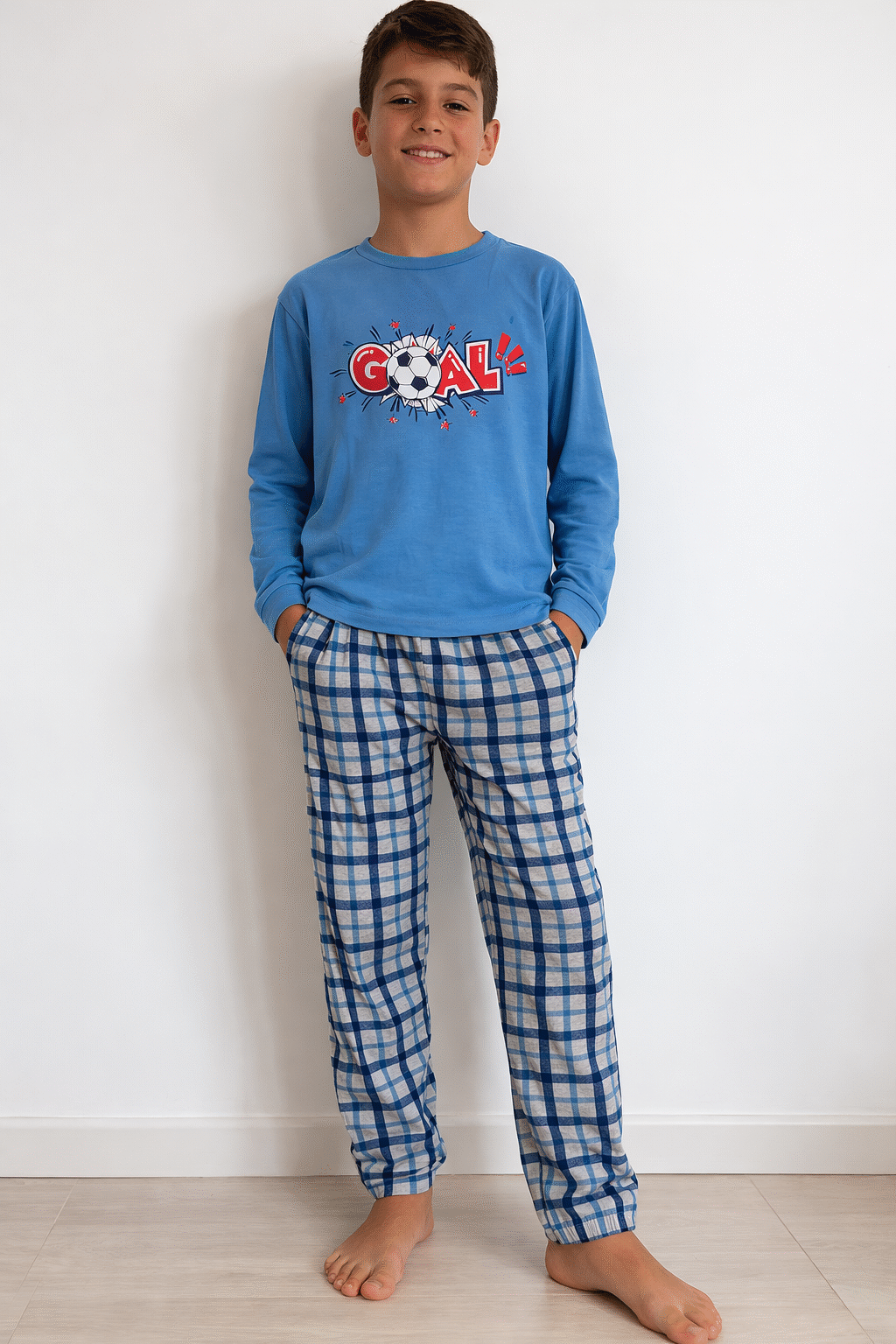 Pijama confortável para menino, ideal para noites de descanso com suavidade e liberdade de movimentos. Conjunto composto por camisola de manga comprida azul com estampado divertido “GOAL” com bola de futebol e calças em padrão xadrez, criando um conjunto prático e jovem.
