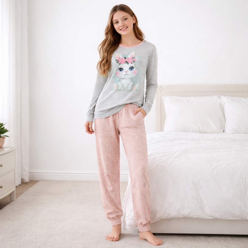 Pijama confortável para adolescente, ideal para noites de descanso com máximo conforto. Conjunto composto por camisola de manga comprida cinza com estampado de coelhinho e calças em tom rosa com padrão floral delicado, criando um conjunto jovem e bonito.