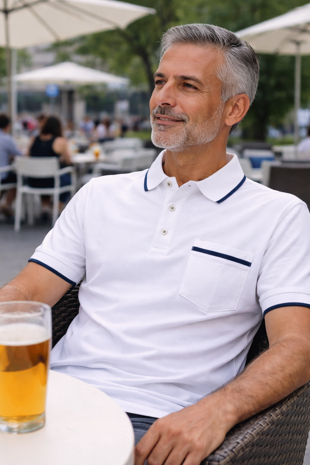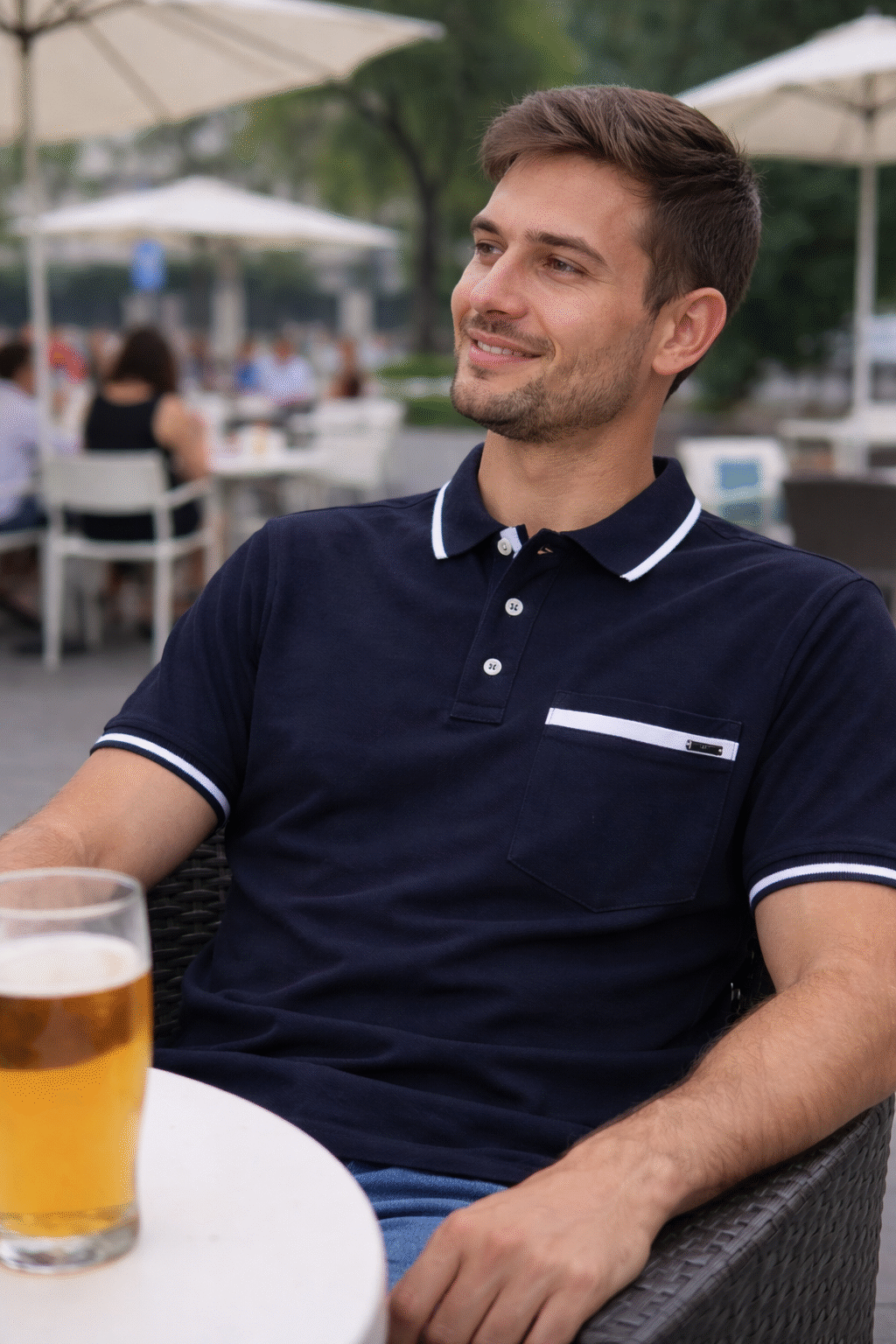Polo elegante e confortável, ideal para o dia a dia ou ocasiões mais descontraídas. Com um design moderno em contraste, destaca-se pela gola e bolso com detalhe em risca branca, dando um toque diferenciador e sofisticado.