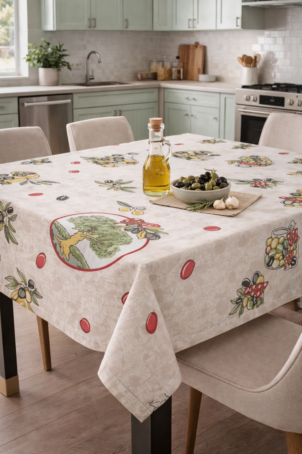 Toalha de mesa prática e decorativa, com padrão inspirado no mediterrâneo, com azeitonas, ramos e garrafas de azeite, ideal para dar um toque rústico e acolhedor à sua cozinha.