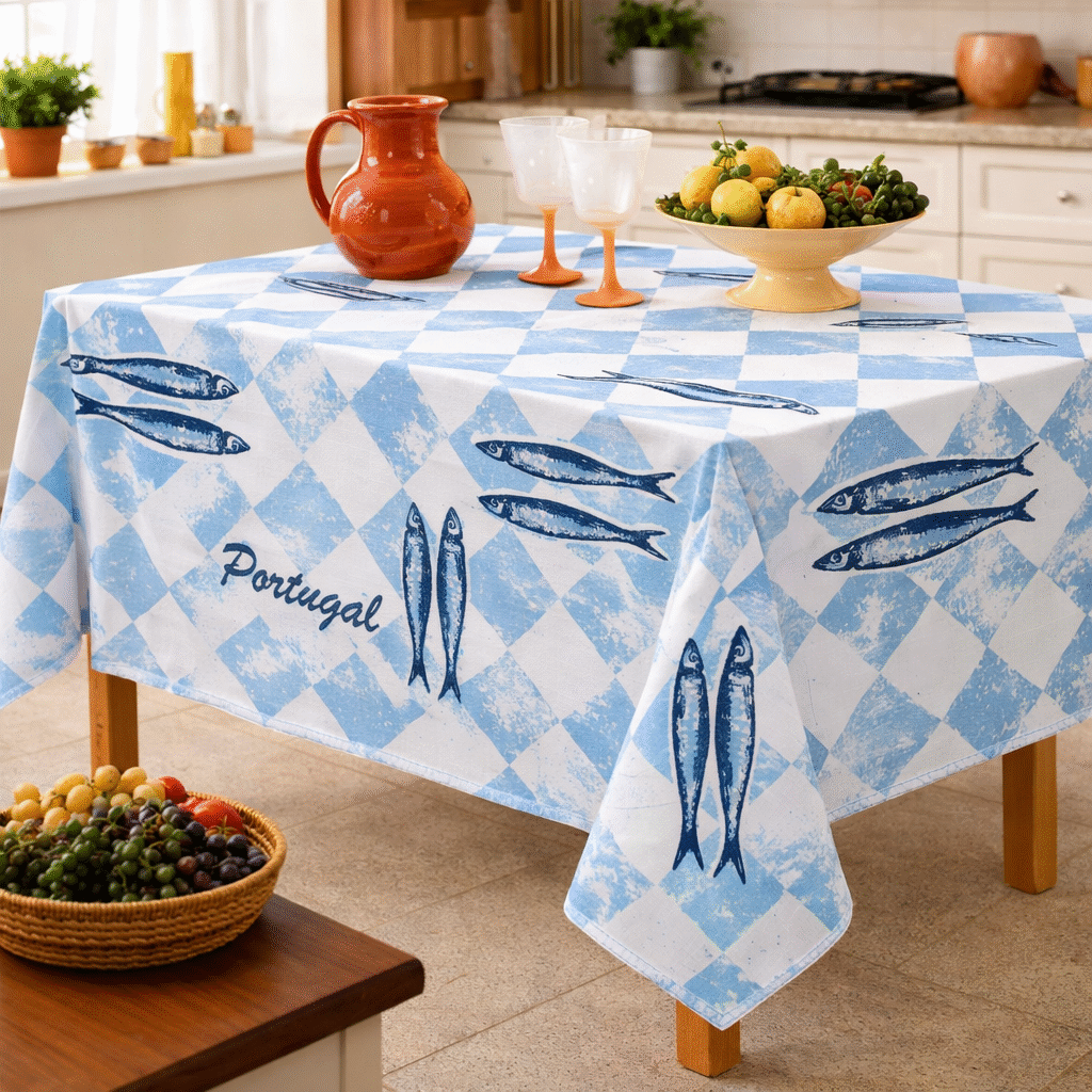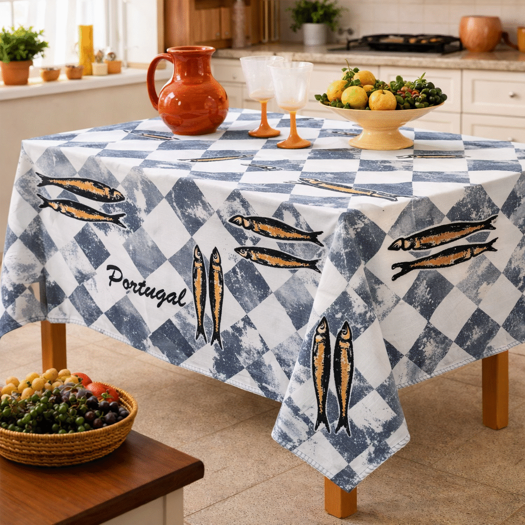 Leve o espírito português para a sua mesa com esta bonita toalha de mesa inspirada nas tradicionais sardinhas portuguesas. Um modelo cheio de charme, ideal para cozinhas acolhedoras e mesas de família.