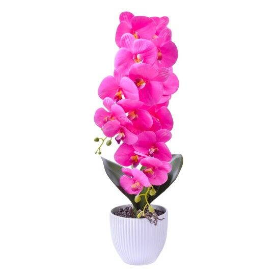 Orquídea artificial rosa em vaso decorativo moderno, perfeita para dar um toque elegante e delicado a qualquer espaço. Com flores realistas e acabamento cuidado, cria um efeito natural sem necessidade de manutenção.